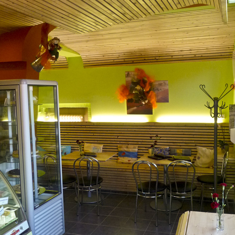 JAHR 2009 ORT ZWENKAU KUNDE EISCAFÉ JAHR 2009 ORT ZWENKAU KUNDE EISCAFÉ In Abstimmung mit dem Kunden wurde ein Gestaltungsvorschlag zur Neugestaltung von Gasträumen eines Eiscafés entworfen. Die alten Räume wurden entkernt und in Trockenbau komplett neu ausgebaut. Im Gesamtvolumen des Ausbaus waren die Deckenverkleidungen, der Sitzbankbau, das Beleuchtungskonzept sowie die Malerarbeiten im Sinne von Komplett-Leistungen enthalten.