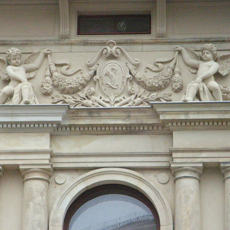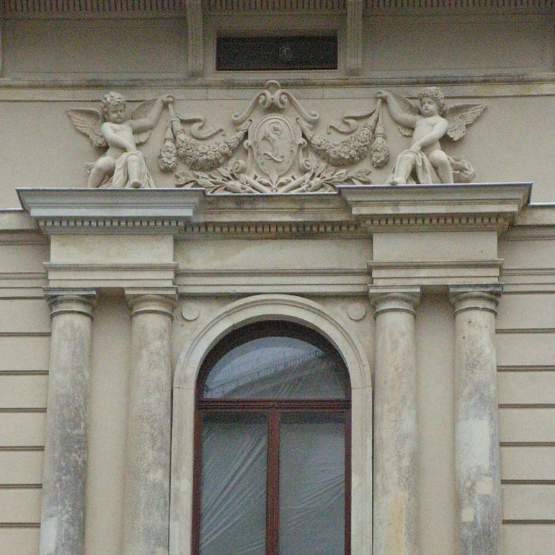 JAHR 2007 ORT LEIPZIG KUNDE - JAHR 2007 ORT LEIPZIG KUNDE - Die Rekonstruktion der Figurengruppe an der historischen Fassade des Forum Thomanum in der Sebastian-Bach-Straße in Leipzig erfolgte nach historischem Vorbild. Der historische Originalbefund wurde geborgen, verfestigt und überarbeitet. Fehlende Elemente wie Tücher, Arme, Flügel und Blumengirlanden wurden teilweise im freien Stuckantrag, teilweise in Tonmodelagen ergänzt bzw. neu hergestellt.