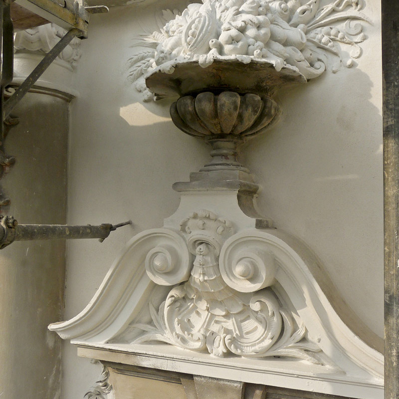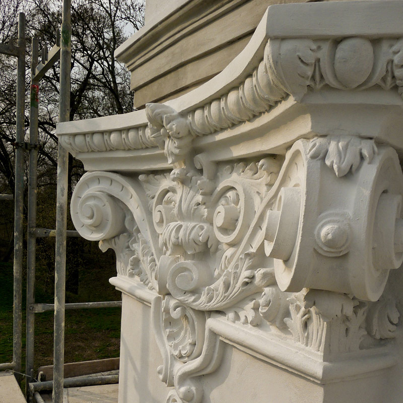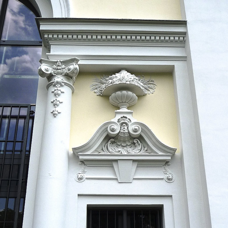 Betonwerksteinsanierung und –aufarbeitung JAHR 2009 ORT LEIPZIG MARKLEEBERG KUNDE - JAHR 2009 ORT LEIPZIG MARKLEEBERG KUNDE - Lose Elemente wurden verfestigt und teilweise neu versetzt, Fehlstellen durch Nachmodelage und Neuabguss mit Betonreparaturmörtel ergänzt und Verwitterte Ornamente und Gesimse reprofiliert.